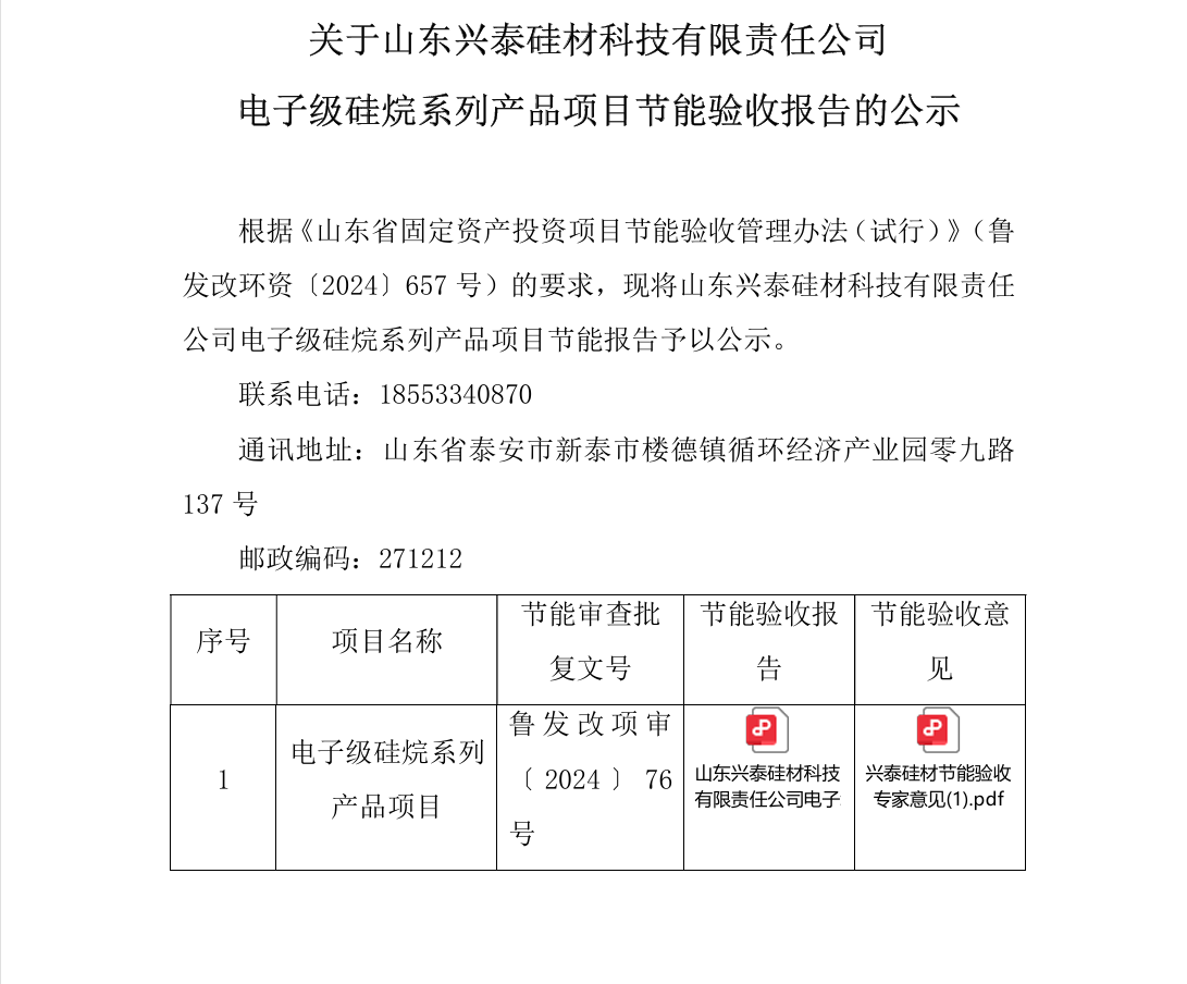 关于山东兴泰硅材科技有限责任公司 电子级硅烷系列产品项目节能验收报告的公示